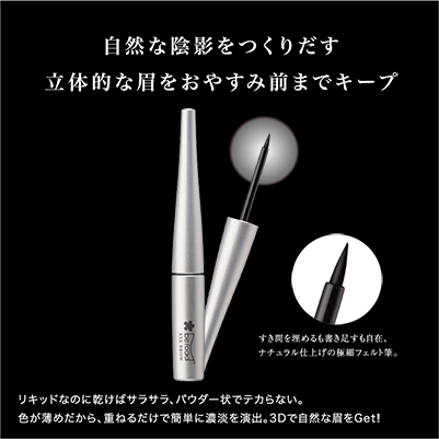 リキッドなのに乾けばサラサラ、パウダー状でテカらない。色が薄めだから、重ねるだけで簡単に濃淡を演出。3Dで自然な眉をGet!