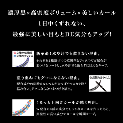 ビューラー嫌いの方でも大丈夫。被膜剤とワックスで生まれた持続力のある上向きカールを、揮発性の高い配合成分で瞬間キープ! しかもパリパリしないやわらか仕立て