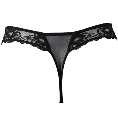 透け感のあるレースにボタニカルな花と植物の刺繍とフリル黒のタンガはセクシーな印象です。