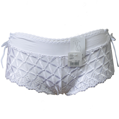 前後にBAHIAならではの光沢感のあるイギリス刺繍とレースをあしらい、デコラティブな刺繍とナチュラルな素材感のコットンで人気のシリーズです。サイドのリボンがキュート。