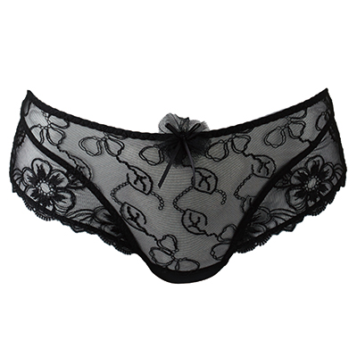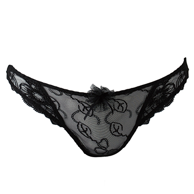 繊細なレースとチュールレースのタンガショーツ。 透け感のあるレースにボタニカルな花と植物の刺繍とフリル黒のタンガはセクシーな印象です。