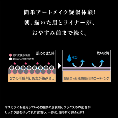 マスカラにも使用している2種類の固め被膜剤と柔らか被膜剤を配合。お肌に密着する膜を張り、ライナーもブロウも落ちにくさMax!。
